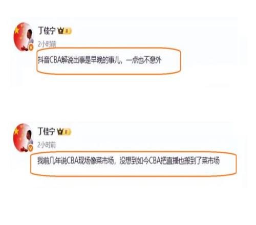 丁佳宁是这样说道:把CBA直播搬到了菜市场,可以说,抖音CBA解说出事是早晚的事,一点也不会感到意外……