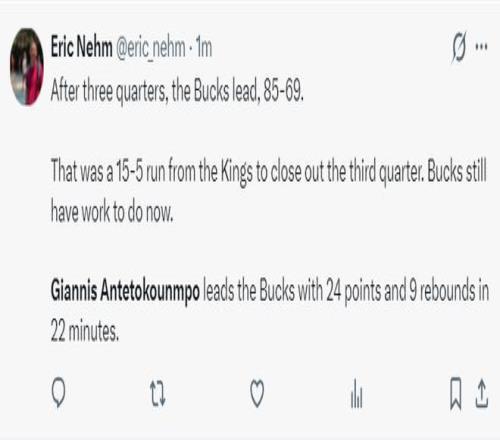 三节打完,扬尼斯21分58秒,12中9,罚球8中6,拿到24分9篮板1助攻,命中率75%,国王孱弱的内线是完全挡不住扬尼斯,国王是联盟防守最差的球队。