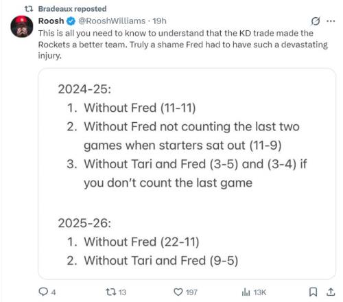 休媒Roosh晒出一张图就可以证明杜兰特的价值有多高:你们需要知道杜兰特的交易让火箭变得多强,如果范弗利特没有遭遇毁灭性的伤病火箭得有多强大啊!