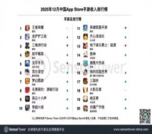 腾讯卫冕2025年12月全球手游发行商收入冠军,旗下《王者荣耀》、《金铲铲之战》、《三角洲行动》与《和平精英》包揽本期中国App Store手游收入榜TOP4。数据显示,《王者荣耀》2025年全年收入(不含中国地区第三方安卓渠道)超过20亿美元。