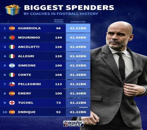 世界足坛主教练引援花费排名!瓜迪奥拉断崖领先引援花费25亿欧