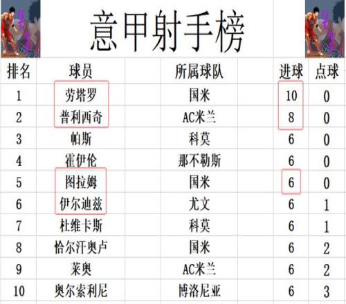 射手榜方面,劳塔罗今天未能破门,还是10球领跑,普利西奇8球位列第2。图拉姆打入锁定胜局一球,追上莱奥,恰尔汗奥卢,伊尔迪兹,奥尔索利尼等人,将前十的门槛提高到6球。