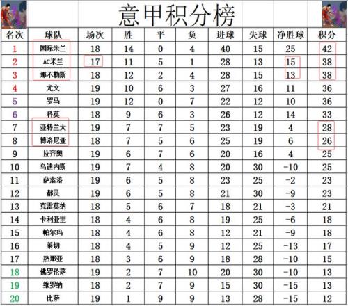 积分榜方面,国米客场完胜帕尔马后豪夺6连胜,先赛的他们多AC米兰4分,继续坐稳榜首位置。那不勒斯今天本有机会暂时超过AC米兰,但他们却在主场爆冷被保级区弱旅逼平,这样的话,2个净胜球的劣势让他们无法超过AC米兰,还是排在第3。亚特兰大在争6大战中击败博洛尼亚,超过后者升至第7。