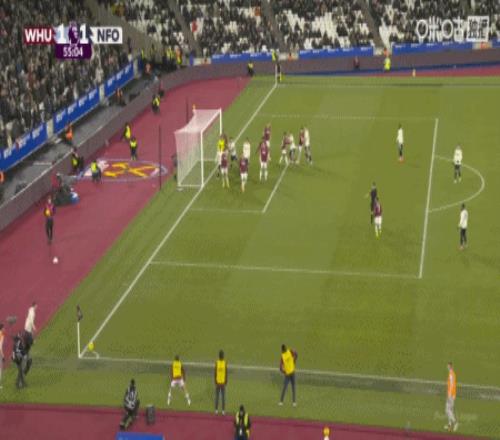 第13分钟,西汉姆联开出角球,穆里略解围不慎自摆乌龙,西汉姆联取得领先。